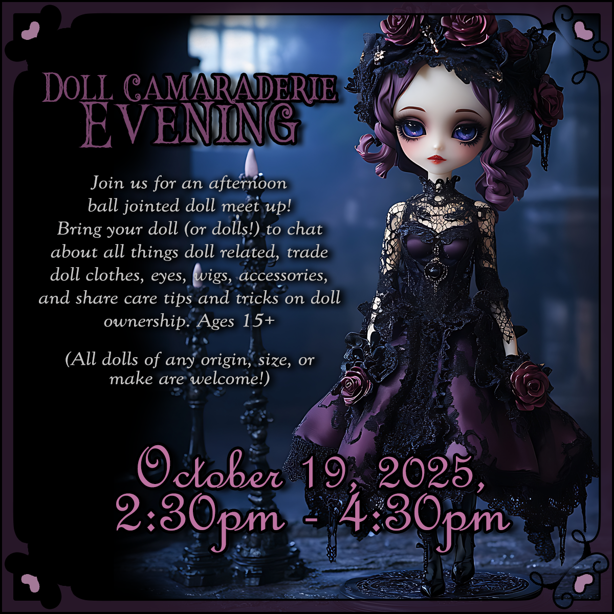 Join us for an afternoon ball jointed doll meet up! Bring your doll (or dolls!) to chat about all things doll related, trade doll clothes, eyes, wigs, accessories, and share care tips and tricks on doll ownership. Ages 15+ (All dolls of any origin, size, or make are welcome!) |