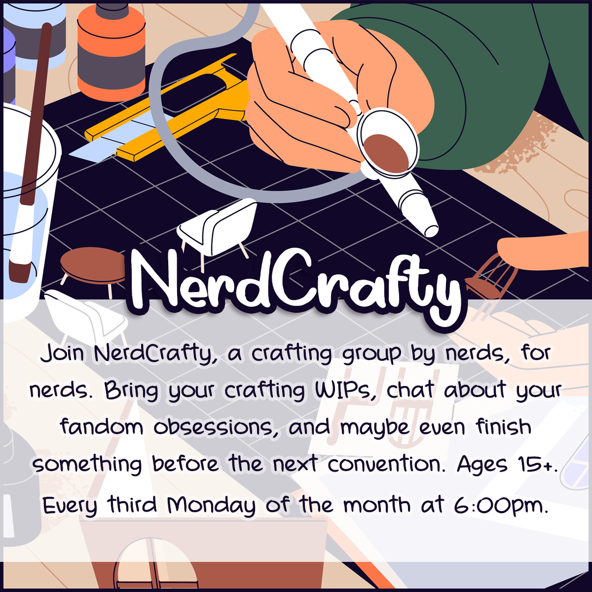 Cosplay cursed? Unpainted miniatures multiplying like tribbles? Ren Faire knitting project you swore would be done last year? We get it. Join NerdCrafty, a crafting group by nerds, for nerds. Bring your crafting WIPs, chat about your fandom obsessions, and maybe even finish something before the next convention. Ages 15+.Every third Monday of the month […]