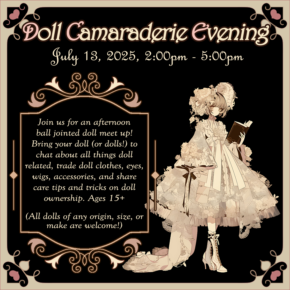 Columbia County Library | Meeting Room 7022 Evans Town Center Blvd, Evans, GA, United StatesJoin us for an afternoon ball jointed doll meet up! Bring your doll (ordolls!) to chat about all things doll related, trade doll clothes, eyes, wigs,accessories, and share care tips and tricks on doll ownership. All dolls ofany origin, size, or make are welcome! Ages 15+